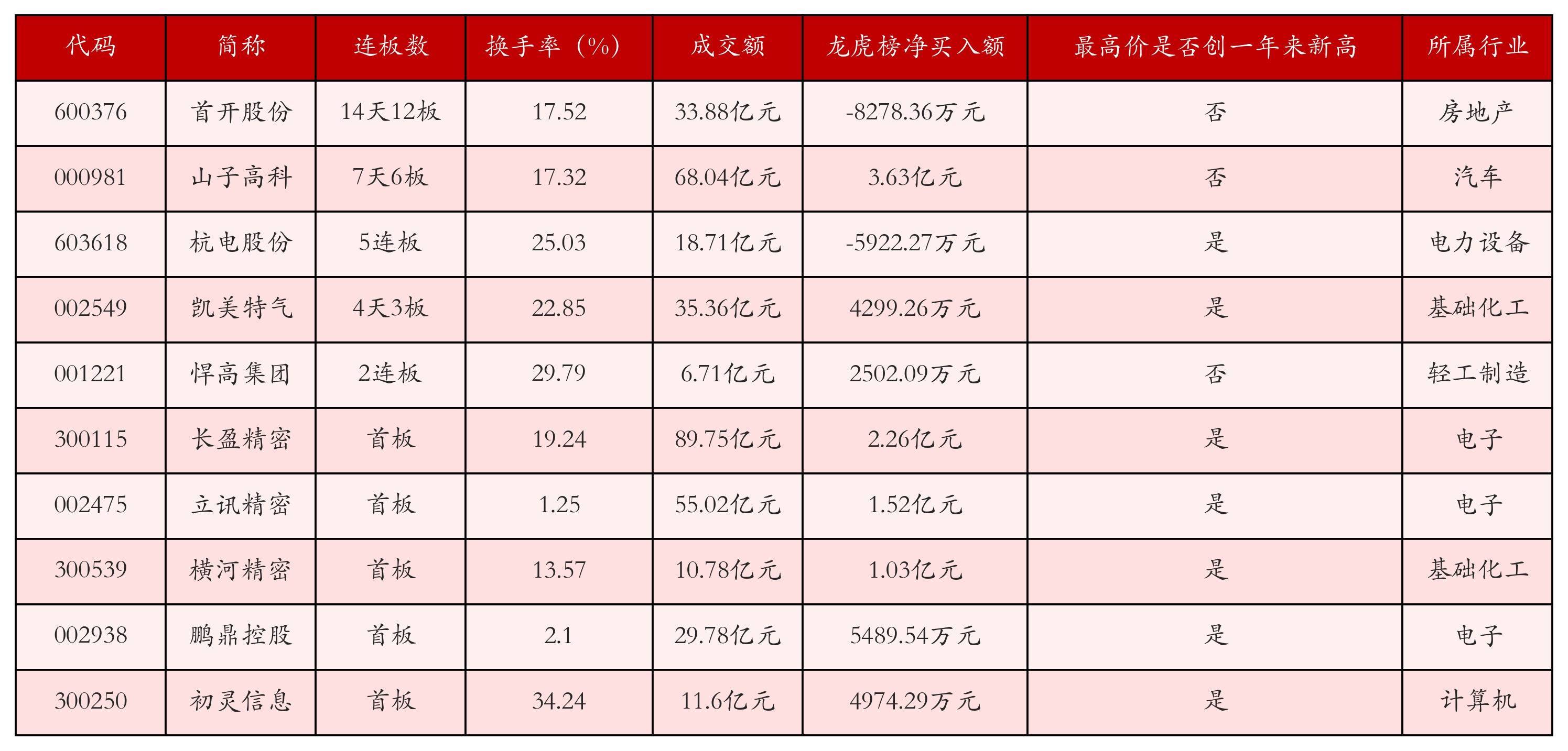 截至9月22日收盘,上证综指上涨0.22%,收于3828.58点,深证成指上涨0.67%,收于13157.97点,创业板指上涨0.55%,收于3107.89点。今日沪深两市A股共计73只涨停,综合当前连板数以及当日龙虎榜数据,其中较为强势的前三只个股分别为:首开股份(600376)、山子高科(000981)与杭电股份(603618)。今日强势个股前10位具体数据见下表: