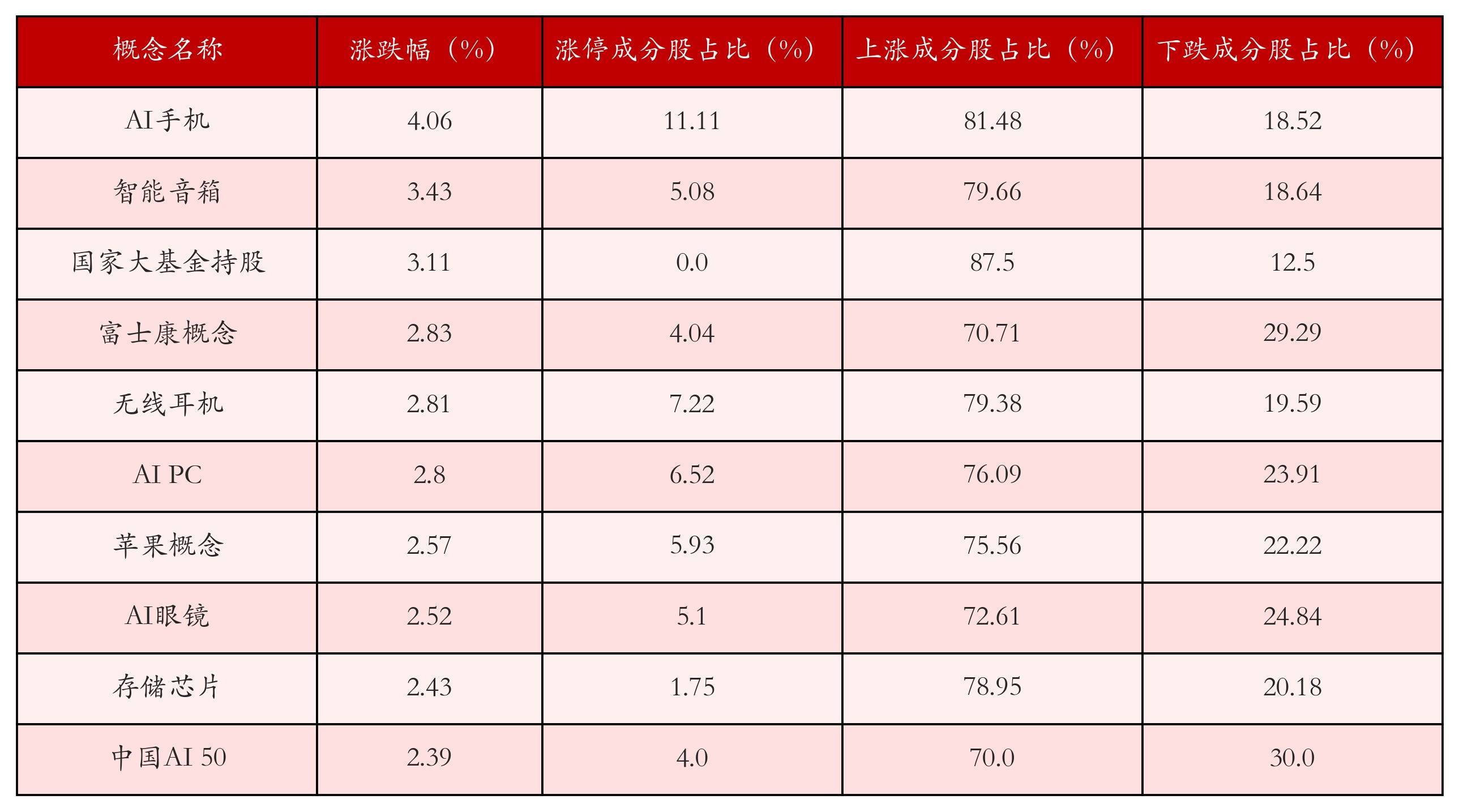 根据A股概念涨跌幅与所对应的股票池综合分析,涨幅靠前的三个概念板块分别为:AI手机、智能音箱与国家大基金持股。排名前10位的概念板块相关数据见下表: