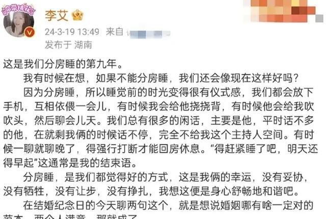 还有知名主持人李艾,她也说自己跟丈夫分房睡九年了,两人感情非但没因此变淡反而更甜蜜了。