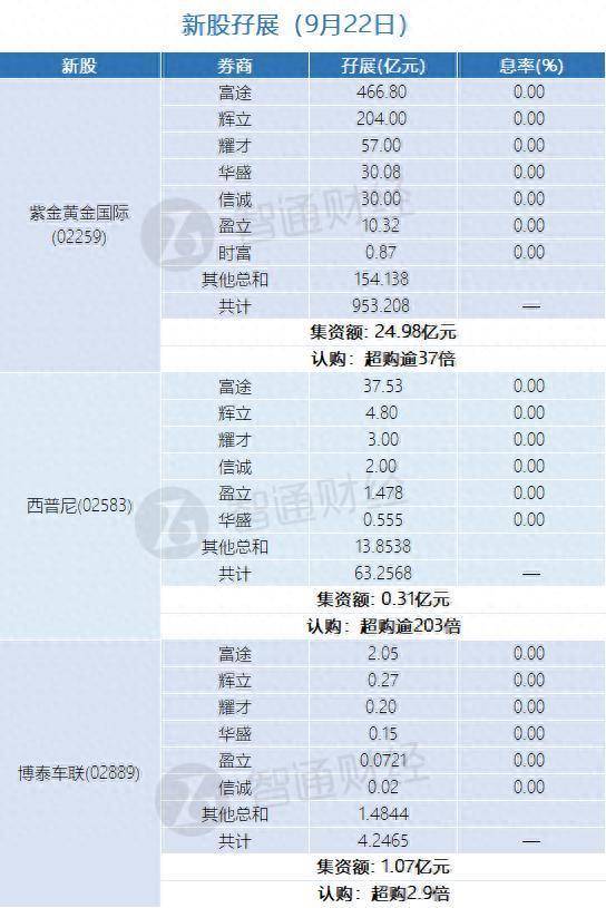 智通财经APP获悉,紫金黄金国际(02259)、西普尼(02583)、博泰车联(02889)正在招股中。截止9月22日,富途、辉立、耀才等券商合计为紫金黄金借出953.208亿港元,超购逾37倍;合计为西普尼借出63.2568亿港元,超购逾203倍;合计为博泰车联借出4.2465亿港元,超购逾2.9倍。